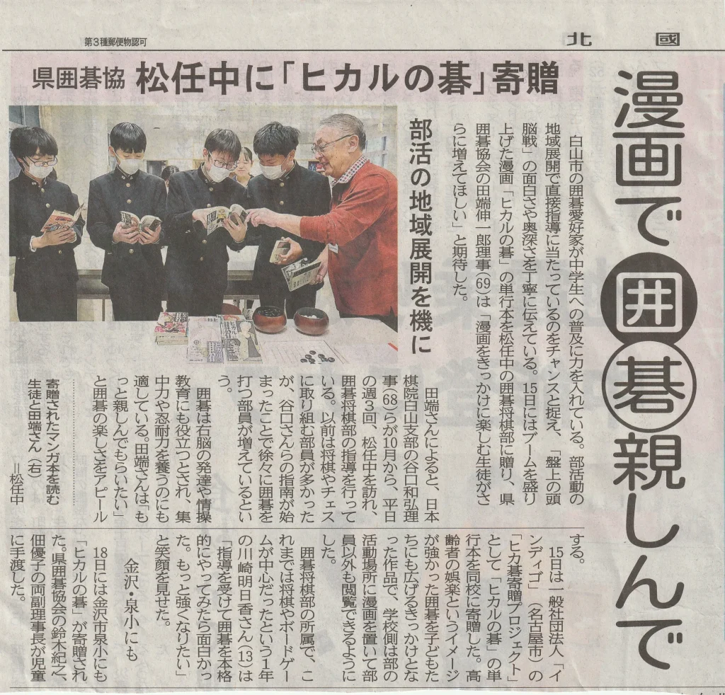 12/15(月)に松任中学校の「囲碁将棋クラブ」様へ『ヒカ碁寄贈プロジェク』が行われました。10月からクラブの講師として子供たちに囲碁指導されている白山支部理事の谷口さん、県囲碁協会理事の田端さんから大ヒット囲碁マンガ「ヒカルの碁」中古全巻セットでお渡しさせていただきました✨