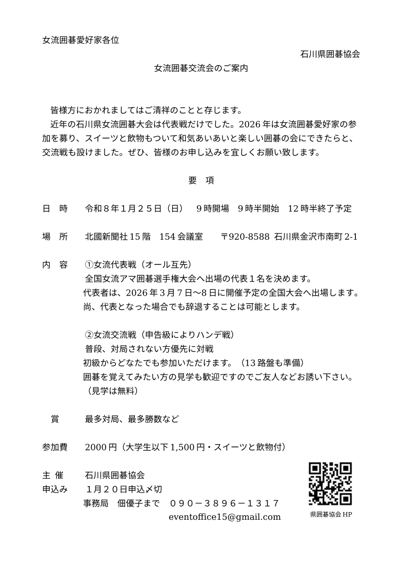 1/25(日)北國新聞社にて「女流囲碁交流会」を開催します!